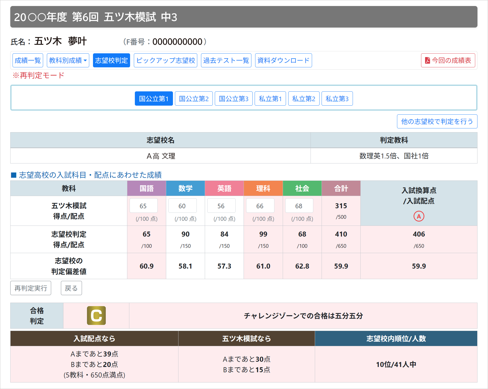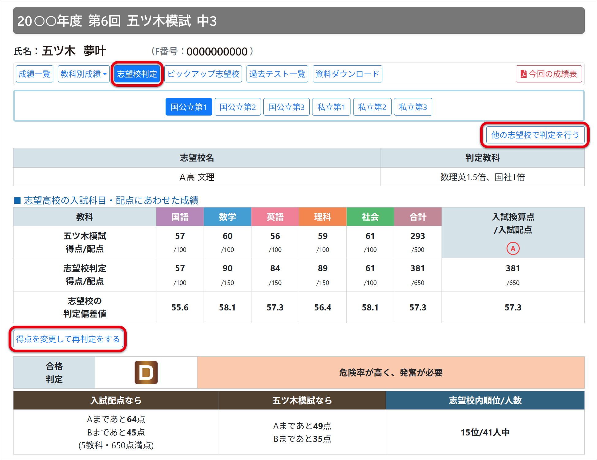 国公立3校、私立3校の志望校判定が一目でわかります。また、私立高校を併願する場合、「専願なら」という判定も右に示されます。