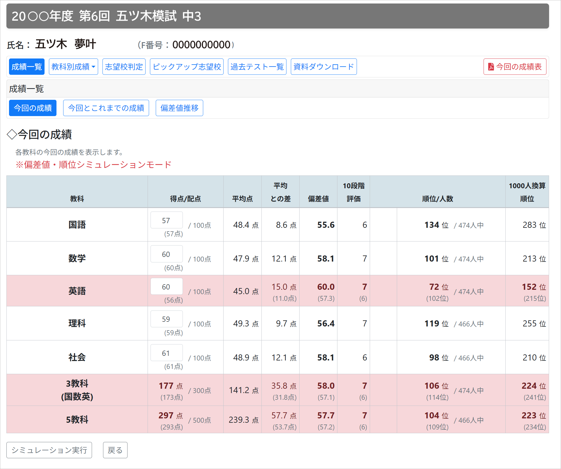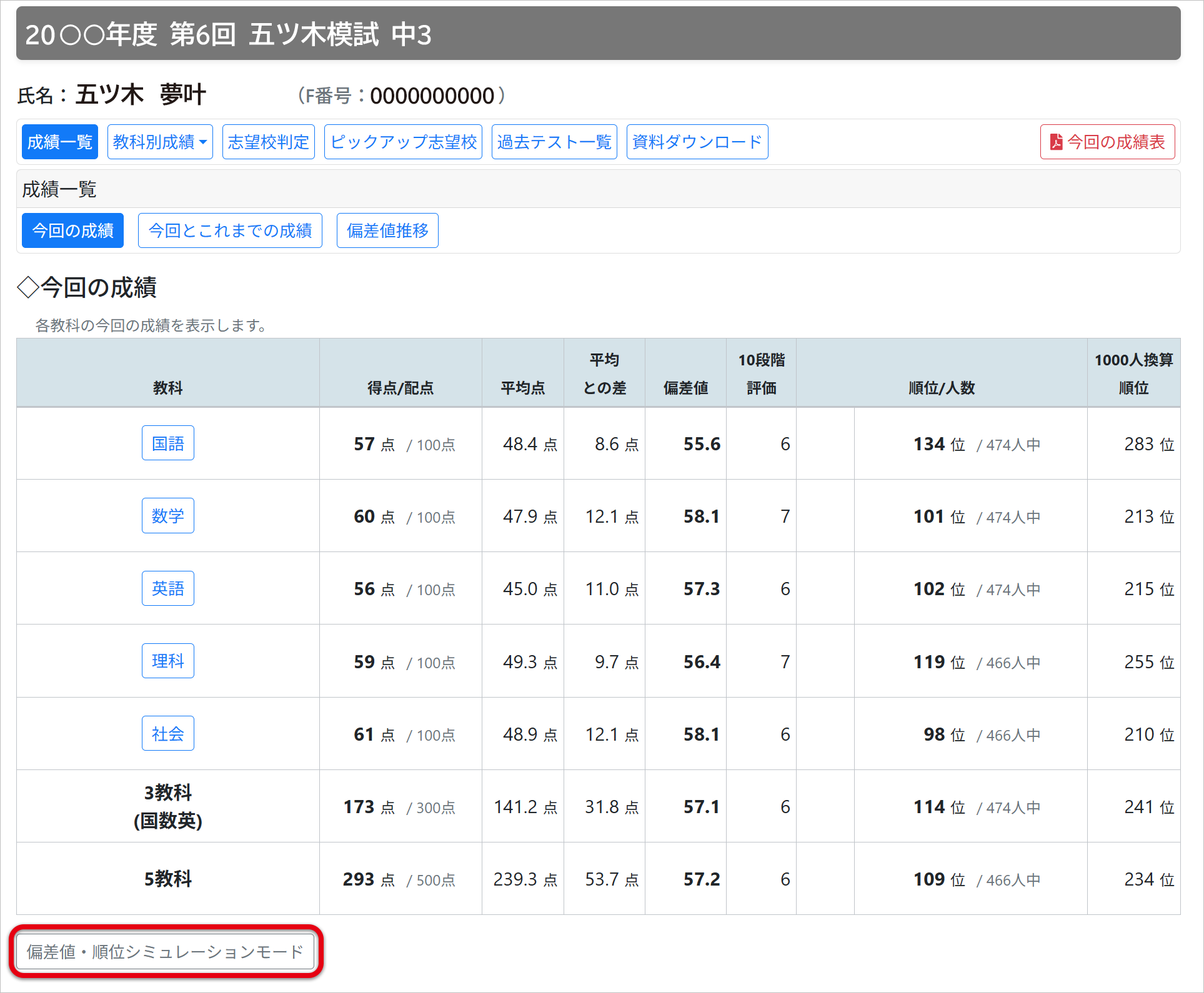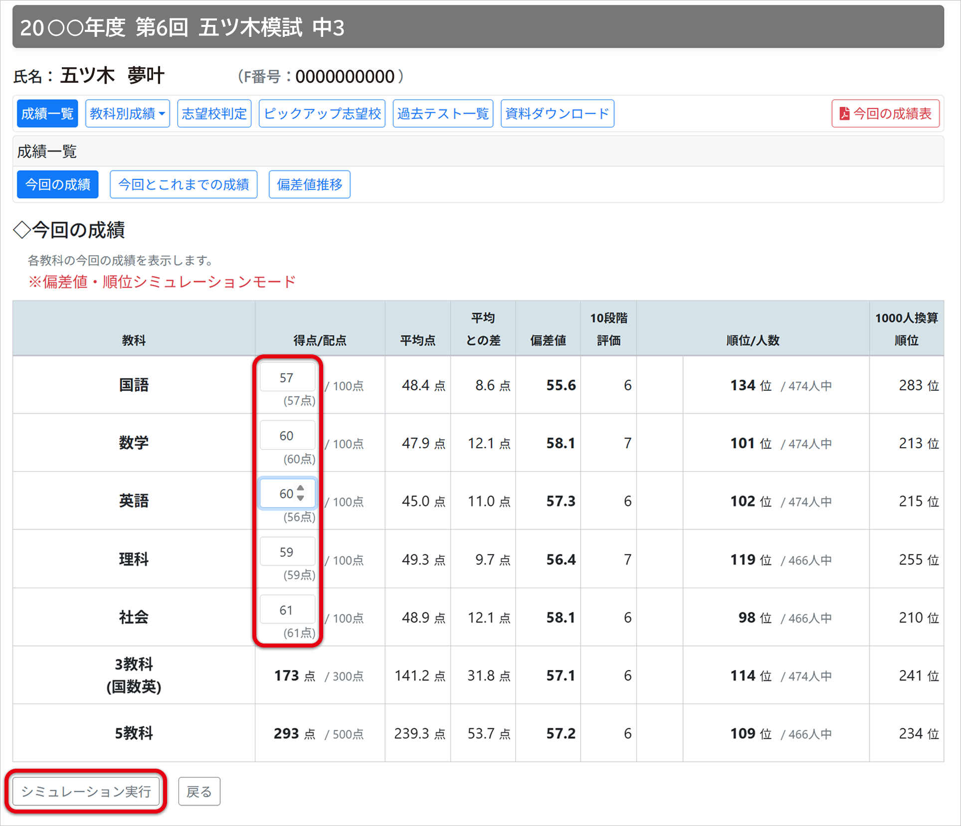 WEB版の個人成績表では、自分の得点を変更して再判定を行う「シミュレーションモード」を使うことができます。変更後の得点は、「この問題を解けていればこの順位になる」という、あてはめ処理の結果として表示されます。